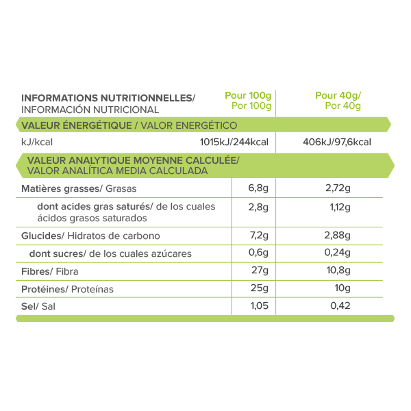 Ingredientes: Proteína de trigo, fibra de trigo, agua, aceite de oliva virgen extra, proteína de guisante, proteína de soja aislada, proteína de avena, salvado de arroz, inulina, almidón de trigo modificado, masa madre seca, emulsionantes (mono y diglicéridos de ácidos grasos, lecitina de girasol), levadura, aroma (alcohol, aroma), sal, fibra cítrica, conservante: sorbato de potasio, aromas. Puede contener: almendras, avellanas, cacahuetes, sésamo, leche, huevo, lupino.