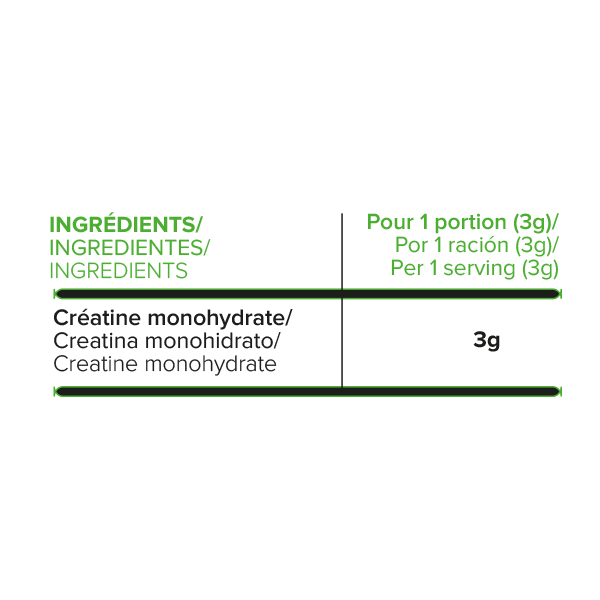 INGREDIENTES: 100% Creatina monohidrato. Puede contener trazas de gluten, leche, soja, huevo, pescado, crustáceos y frutos de cáscara.