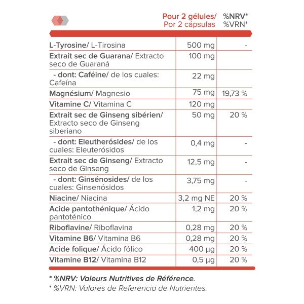 Exto. seco de Eleuterococo y Exto. Seco de Ginseng, adaptógenos. Mejora del rendimiento físico y mental y la resistencia al estrés. En algunos estudios se ha demostrado que refuerza la capacidad del individuo en estados de agotamiento psicofísico, aumentando su capacidad psicológica, reduciendo la sensación de cansancio y actuando como reconstituyente general.
